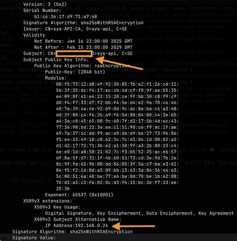 When creating the server certificate, sys-API will call https://ifconfig.me to retrieve the public IP to populate Common Name(CN) and then list the servers local ipv4 addresses and put those into Subject Alternative Name(SAN).
